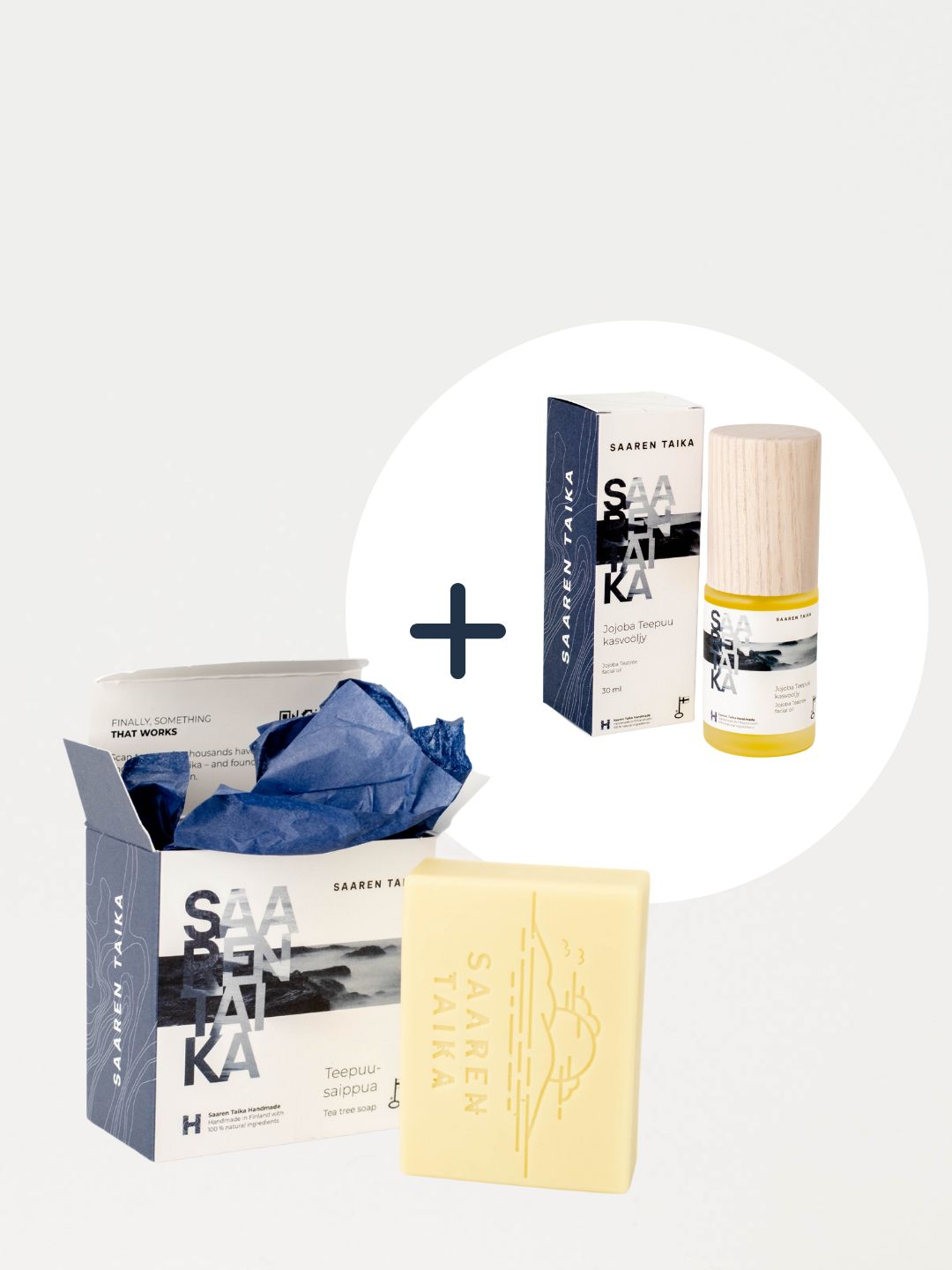 Tuotesetti sisältää Jojoba & Teepuu kasvoöljyn, sekä Teepuusaippuan.