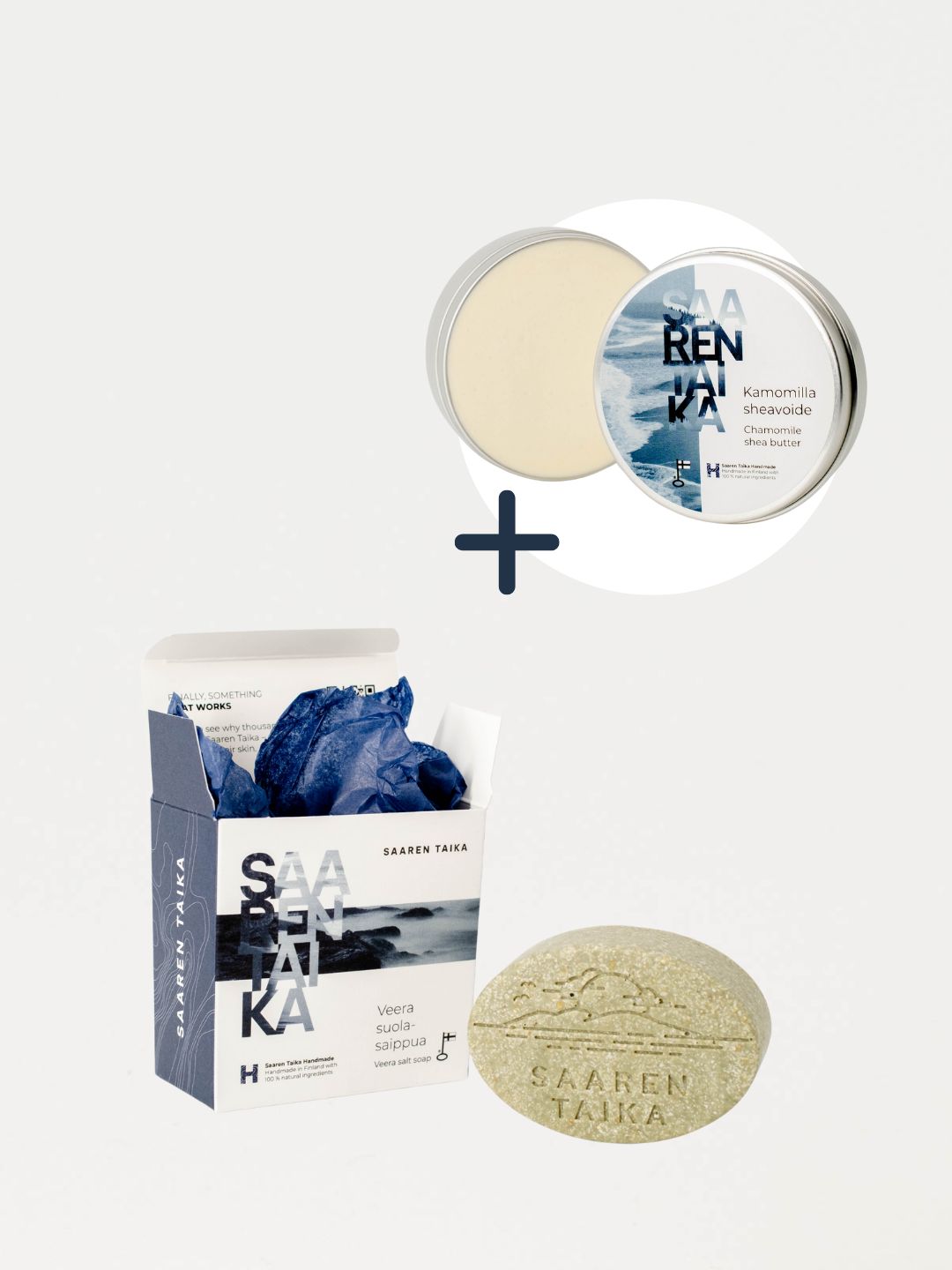 Psori-iholle sopiva settimme sisältää myös kutinaa nopeasti rauhoittavan Kamomilla Sheavoiteen, joka auttaa suojaamaan kuivaa tai ärtynyttä ihoa. Kamomilla Sheavoide on syntynyt Saaren Taika tuotekehittäjän oman atooppisen ekseema-ihottuman hoitoon.