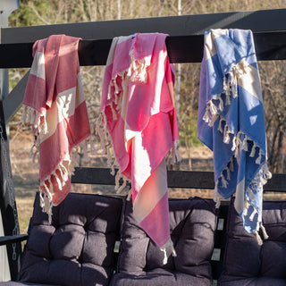 A Hammam towel is not just a bath towel. It can also be used as a picnic blanket, scarf, sarong, beach towel and many other convenient everyday textiles. It is highly absorbent and dries quickly, which makes it perfect for traveling, at the cottage, on a boat, on a backpacking trip or for a schoolchild!