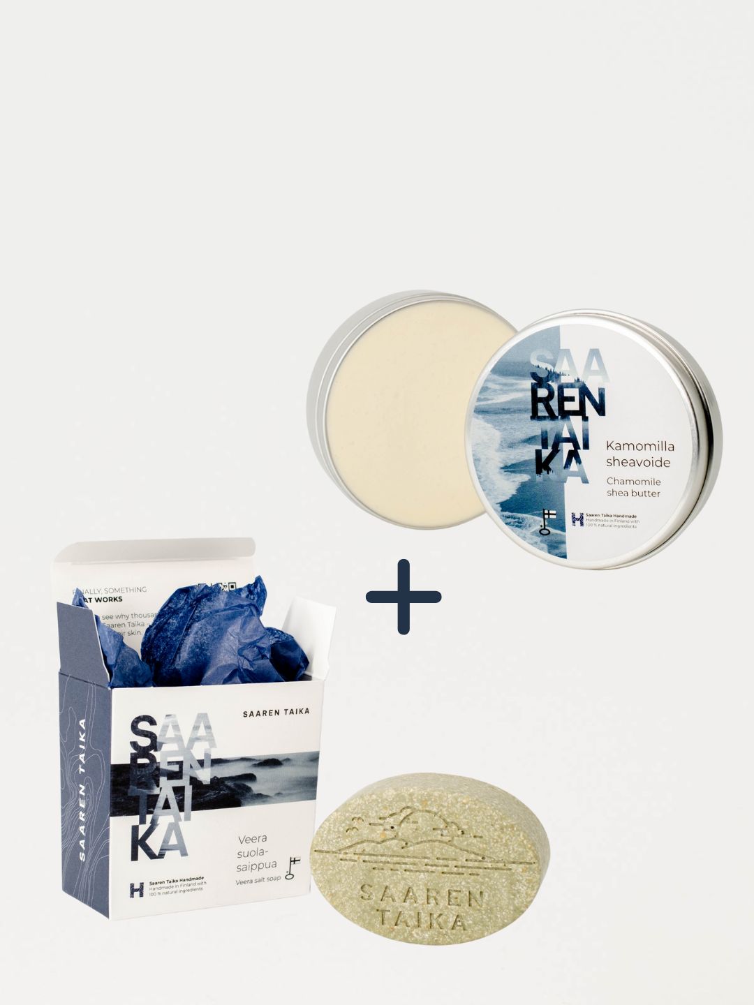 Psori-iholle sopiva settimme sisältää myös kutinaa nopeasti rauhoittavan Kamomilla Sheavoiteen, joka auttaa suojaamaan kuivaa tai ärtynyttä ihoa. Kamomilla Sheavoide on syntynyt Saaren Taika tuotekehittäjän oman atooppisen ekseema-ihottuman hoitoon.