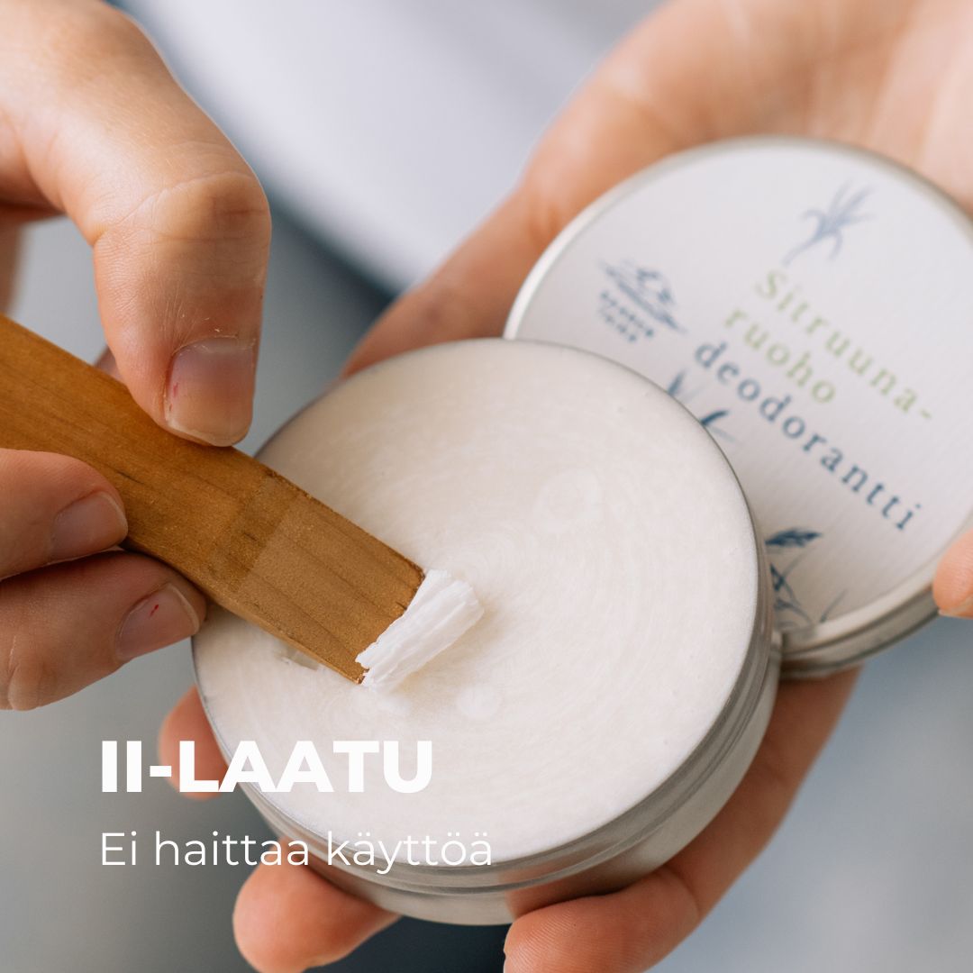 Käyttö: Ota pieni määrä, n. herneen verran voidetta sormien väliin ja hiero sormissa tasaiseksi, levitä sitten ohuelti kainaloiden iholle.