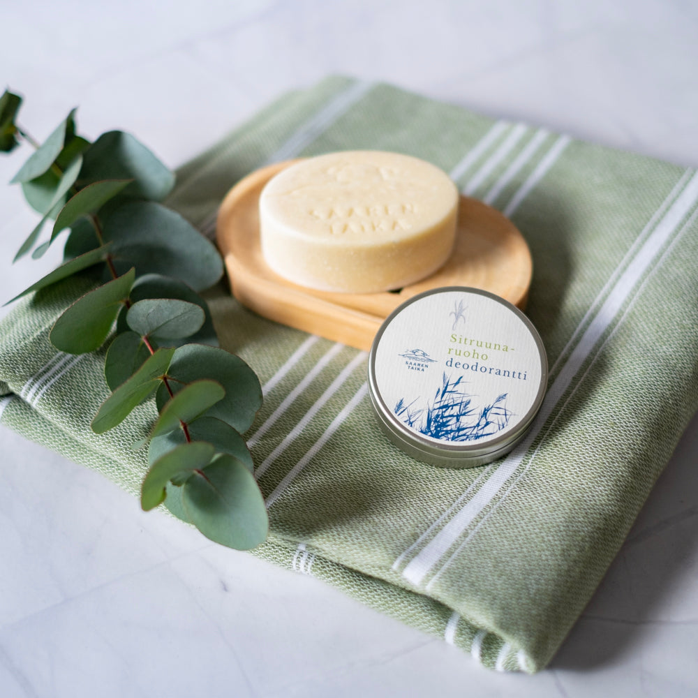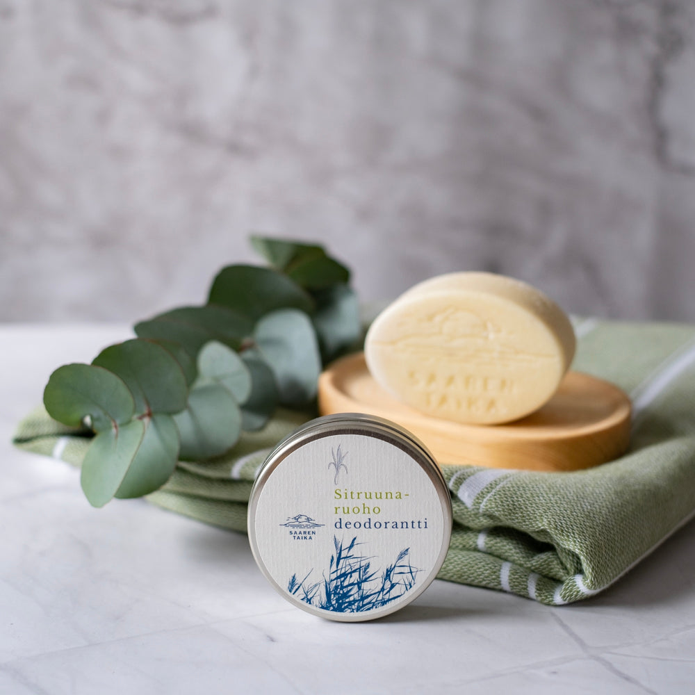 Suosittelemme päivittäiseen pesuun Saaren Taika Suolasaippuaa, joka tehostaa mietojen voidedeodoranttien tehoa hienhajujen ehkäisyssä.