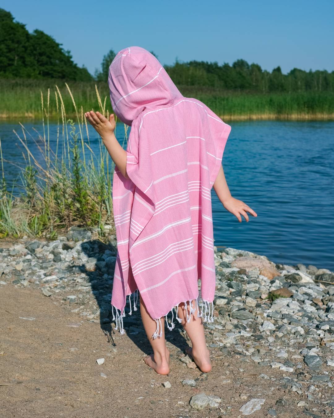 Lasten kylpyponcho kuivuu nopeasti silti säilyttäen pehmeytensä, minkä ansiosta se tuntuu käytössä erityisen miellyttävältä. Kylpyponcho on myös kätevä ottaa mukaan matkoille, kylään, uimaan, mökille tai minne vaan! Lasten kylpyponchon käytännöllinen huppu suojaa lapsesi päätä esimerkiksi auringolta tai tuulelta. Hihaton malli on helppo pukea ja riisua kiireisinäkin hetkinä. Edessä oleva tasku ja helmassa liihottavat hapsut luovat leikkisät yksityiskohdat kylpyponcholle.