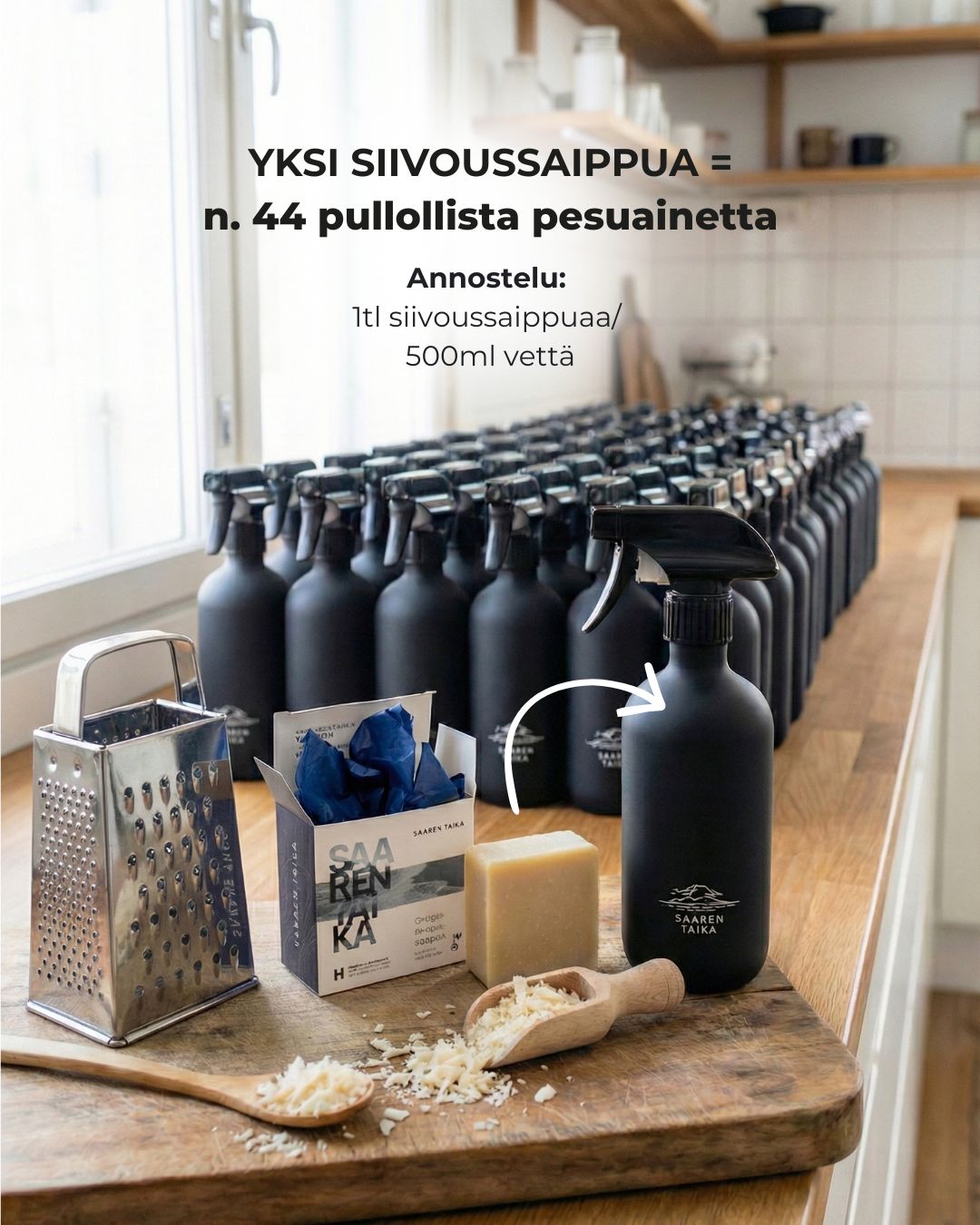 Yhdestä siivoussaippuapalasta saa valmistettua n. 22 litraa valmista siivoussuihketta (raastettuna n. 1tl / 500ml vettä).