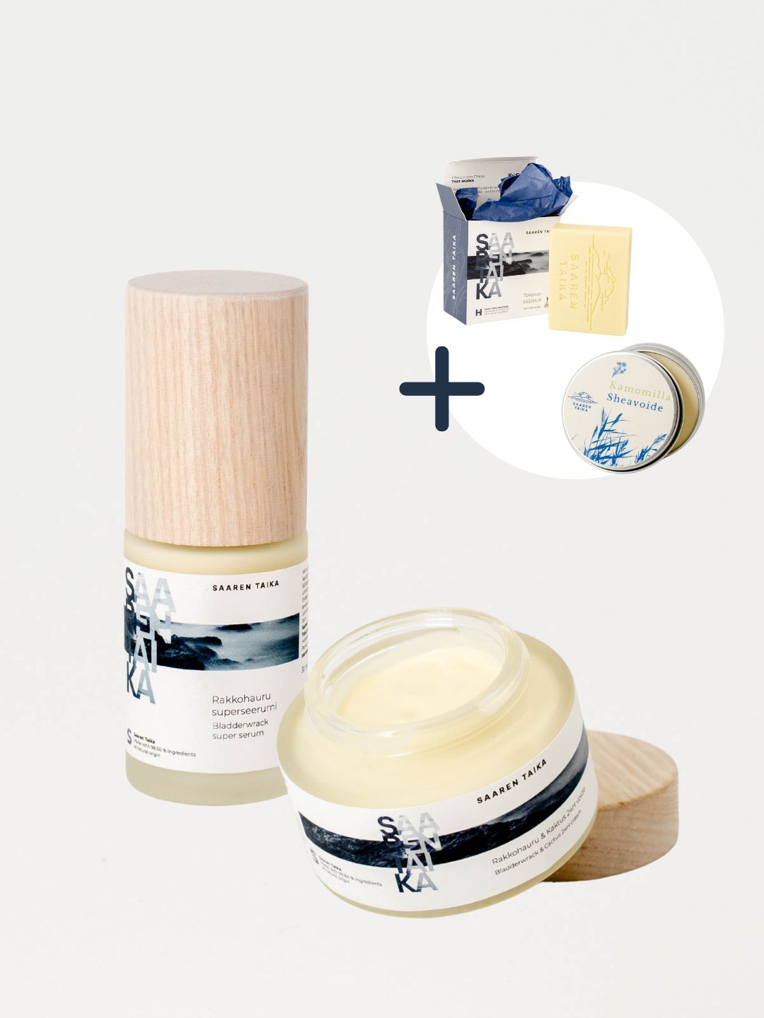 Tilaa nyt Satu Tuomiston suosikkituotteet yhdessä setissä ja saat rahanarvoisen edun! Setti sisältää Rakkohauru Superseerumin ja tehokkaan Rakkohauru Kaktus 24H kasvovoiteen yhdessä paketissa. Saat kaupan päälle Teepuusaippuan sekä Kamomilla Sheavoiteen 30ml (lahjan arvo 51,90 €).