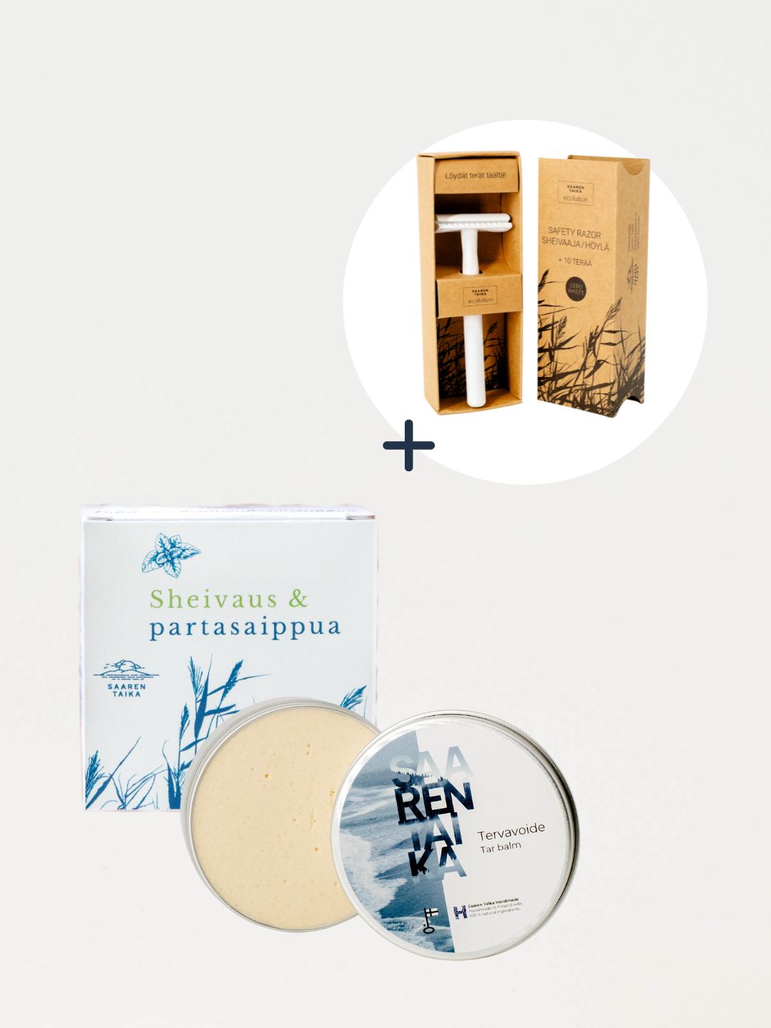 Rakpresentset: Tjärkräm, eko-rakapparat och raktvål för pappa