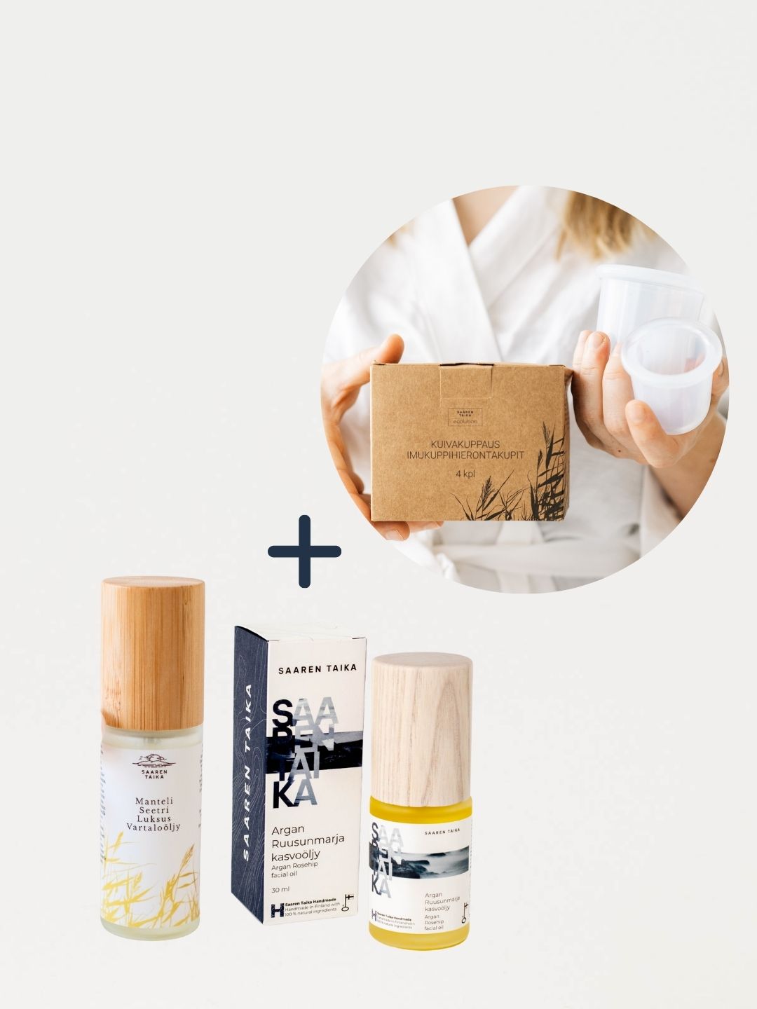 Sugkoppsmassagekopparna som ingår i sugkoppsmassagesetet samt Manteli Setri Luxury body oil och Argan Roseberry Luxury ansiktsolja möjliggör en avkopplande torr koppningsstund hemma!